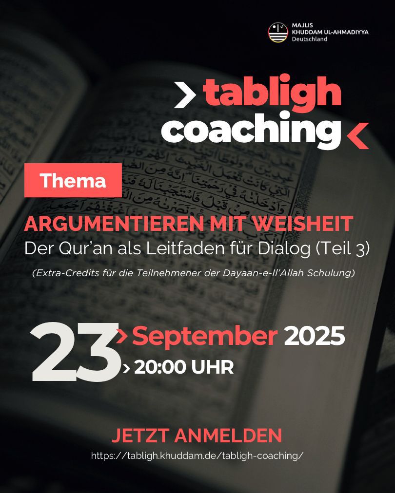 Das Tabligh Coaching ist ein monatlich stattfindendes Programm, das speziell zur Ausbildung und Wissenserweiterung der Khuddam-Brüder ins Leben gerufen wurde. Ziel dieses Programms ist es, den Brüdern fundiertes Wissen …